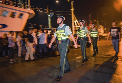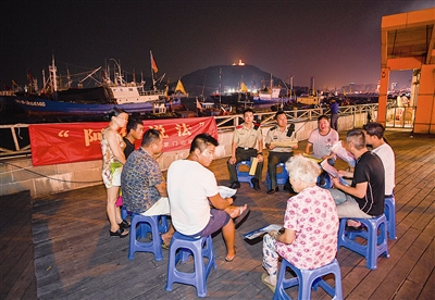 林华是沈家门边防派出所一名年轻民警,当晚他带领民警徐博文和陶晨涛,一同前往国际水产城巡逻。“我们先去临街的海堤上走走。”他带着记者,熟门熟路地来到海堤边,“阿伯……阿婶……”地一路招呼着。此时,海堤上聚集着一群纳凉的群众,林华拉过一把凳子坐下,就和大伙聊开了。