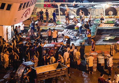 舟山市沈家门港,全国最大的渔港,东海渔场的中心,和秘鲁的卡亚俄港、挪威的卑尔根港并列为世界三大渔港。每年,沈家门港的渔货吞吐量超过百万吨,居全国首位。8月1日开捕后,靠岸渔运船增多,渔货交易量一路攀升,而凌晨又是交易的高峰期,沈家门港因此成了一个不眠港。