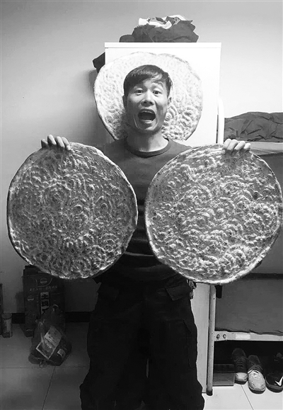 | 张杰拿着比脸盆还大的馕饼 |