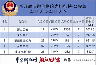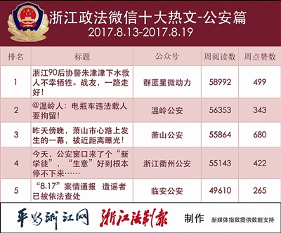 热文榜上,“群蓝星微动力”的《浙江90后协警朱津津下水救人不幸牺牲。战友,一路走好!》感情真挚,令人动容,获得第一名。“温岭公安”的《@温岭人:电瓶车违法载人要拘留!》获得第二名。“萧山公安”的《昨天傍晚,萧山市心路上发生的一幕,被近距离曝光!》及时回应本地热点,获得第三名。
