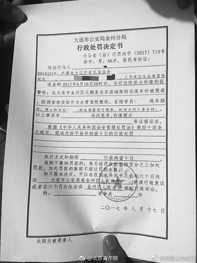 8月21日上午,“男子学车期间被驾校教练猥亵”一事受害者,在网上公布警方提供的行政处罚决定书。决定书由大连市公安局金州分局作出,内容显示:2017年8月16日20时许,后石边防派出所接到报警称,在大连市金州区大魏家后石滨海路附近练车时被猥亵。经调查核实,徐升为永青驾校(注:应为永青女子驾校)教练,在陪学员练车期间,用口和手对其生殖器进行猥亵,时间大约10多分钟。根据相关规定,现决定给予徐升拘留10日的行政处罚。