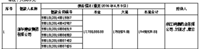 | 单位: 人民币元 注:1、清单中“担保人”包括保证人、抵押人、出质人,担保人的担保范围以签署的合同等法律文件约定为准。如公告中债务人、合同编号、债权金额、担保人等信息与事实不符的,以签署的合同等法律文件约定为准。 2、本公告清单列示截至2016年4月8日的贷款本金余额,借款人和担保人应支付给浙江台州黄岩熙泽资产管理有限公司的利息、罚息、违约金及其它应付款按借款合同、担保合同及中国人民银行的有关规定或生效法律文书确定的方法计算,实际计算与欠息金额不一致,以实际计算为准。已经进入诉讼程序的,并已由浙江省浙商资产管理有限公司垫付的应由借款人及担保人负担的诉讼费、执行费等以有关法律文书确定的金额为准。 3、若借款人、担保人因各种原因更名、改制、歇业、吊销营业执照或丧失民事主体资格的,请相关承债主体及/或主管部门代位履行义务或履行清算责任。 |