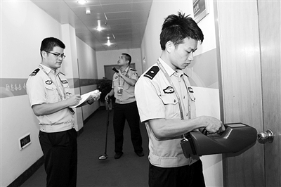 | 张亮利用炸药探测仪对门把手进行检查 |
