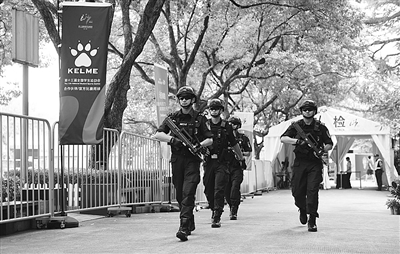 向记者介绍时,汪雁东巡逻的脚步丝毫没有停下,眼睛不时瞄向四周。“我们的任务,可不是简单地走走路,而是要时刻关注周边情况。”汪雁东说,每名全副武装的队员,装备重达40斤。巡逻完排球馆这个比赛重点场所后,他们还要扩大范围,到校园里巡逻。像当天共有4场比赛,安保任务就要从13时一直持续到22时比赛结束。虽然队员们每2小时才进行一次巡逻,但一趟巡逻下来大概需要100多分钟,即使是回到备勤点休息的10多分钟里,他们也不敢放松,身上的装备甚至都不会脱下来。