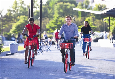 9月20日,在美国首都华盛顿,人们试骑摩拜单车。