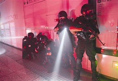 | 特警突击队员在地铁站内与“暴恐分子”斗智斗勇 |
