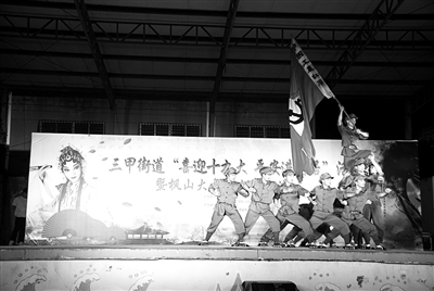 台州椒江三甲街道通过基层文艺晚会,用群众喜闻乐见的节目,吸引广大群众参与到平安建设中来,为迎接十九大的召开营造和谐稳定的社会环境。图为10日晚上,三甲街道在三丰村文化礼堂举办“喜迎十九大 平安进村居”文艺晚会。
