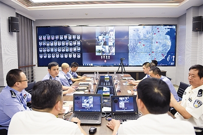 大屏幕的最左边,有44个诈骗团伙头目的方形照片,一排10个,排了5排;最右边是一张中国地图,标注着21个诈骗窝点,遍布重庆、四川、广东、福建、广西、河北、河南、湖北、湖南等省市。每个点都有警力部署,总共800余名,现场视频直播连线,点击任何一个点,都会在中间的大屏幕放大显示。