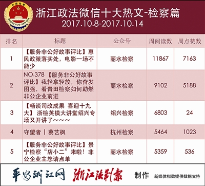 本周的检察热文榜中,“丽水检察”的“服务非公好故事评比”系列文章占据了大量席位,很多文章的标题趣味十足。其中《我轻拿轻放,你奋发图强,看青田检察如何助燃非公企业前进》的标题中,“轻拿轻放”四个字生动地展现了检察院与非公企业互动过程中的形象。