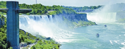 尼亚加拉瀑布位于加拿大与美国交界,是世界最大瀑布之一,水流量达到每秒大约2400立方米。