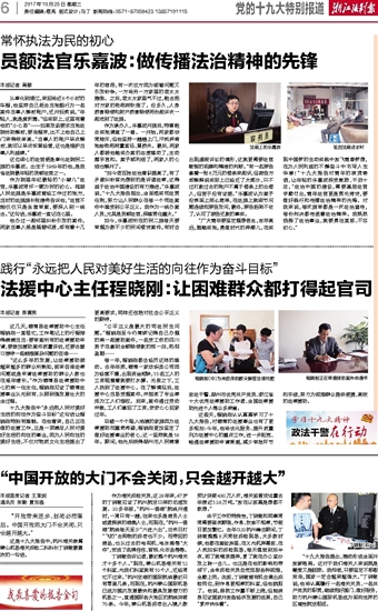 “广大青年要坚定理想信念,志存高远,脚踏实地,勇做时代的弄潮儿,在实现中国梦的生动实践中放飞青春梦想,在为人民利益的不懈奋斗中书写人生华章!”十九大报告对青年的滚烫寄语,让年轻的乐嘉波深受激励、干劲十足。“法治中国的建设,需要基层法官辛勤付出,青年法官更是责无旁贷,要做好践行和传播法治精神的先锋。对我来说,每次庭审都是一次法治宣传,每份判决都传递着法治精神。我既然选择了法治事业,就要勇往直前、不忘初心。”