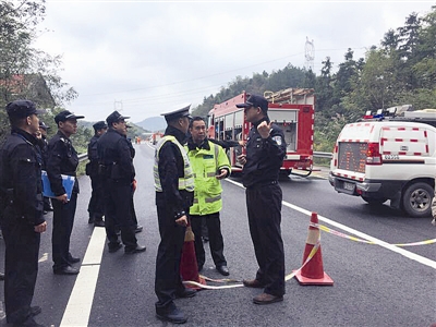 | 葛良昌(中间穿反光雨衣者)向救援人员介绍事故情况 |