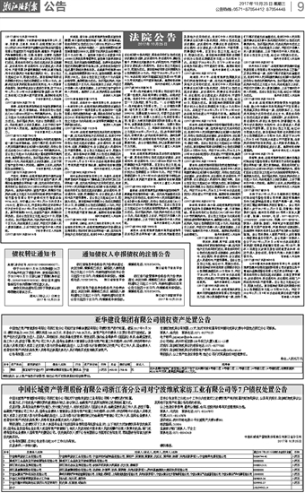 中国长城资产管理股份有限公司浙江省分公司对宁波维欣家纺工业有限公司等7户债权处置公告