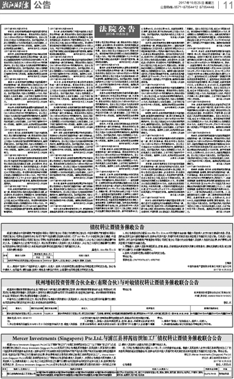 Mercer Investments (Singapore) Pte.Ltd.与浦江县梓芮纺织加工厂债权转让暨债务催收联合公告