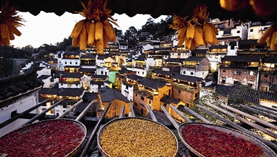 近日天气晴朗,江西省婺源县江湾镇篁岭村村民抓住时机采摘、晾晒皇菊及蔬果。明黄的菊花、火红的辣椒……各种颜色将篁岭古村装扮成巨大的“调色板”,引来众多游客感受乡村美景。新华社 宋振平 摄