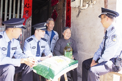 10月26日,重阳节来临之际,台州市公安局椒江分局下陈派出所民警带着大米、油等生活用品来到辖区高张村,看望困难老人79岁的王香彩和她75岁的老伴阮领招,让老人感受到节日的温暖。通讯员 何文斌