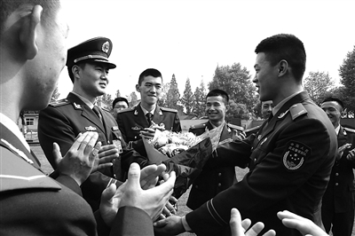 10月27日,武警杭州支队一大队的官兵们,迎来了他们引以为豪的人——党的十九大代表、该大队大队长刘超。刘超一走进营区,官兵们立即围了上去,询问他在北京参加盛会的见闻和感受。刘超向官兵们介绍了参会情况,简要传达了大会精神,并勉励官兵下一步要全面学习深刻领会十九大精神,以百倍的努力投身强军兴军的伟大征程中。