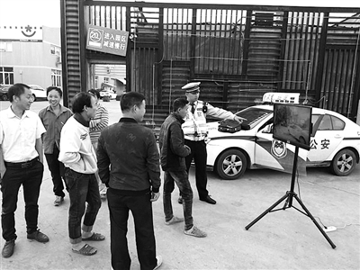 平阳交警大队结合辖区实际,深入工厂开展道路交通安全宣传活动。图为昨日下午,民警来到当地一工业园区门口,播放事故案例宣传片《任性的代价》,并结合片中内容现场解说交通法律法规。