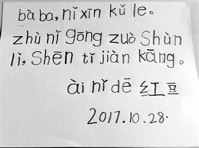 信不长,只有短短的两三行,而且还是用拼音写的:“bàba,nǐ xīn kǔ le。zhù nǐ gōng zuò shùn lì,shēn tǐ jiàn kāng。”落款是“ài nǐ de 红豆 2017.10.28”。