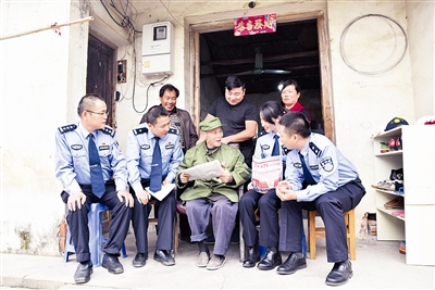近日,海盐县公安局百步派出所民警利用下班时间,来到辖区百岁老党员魏长贵家中,一起学习十九大精神,上了一堂特殊的党课。