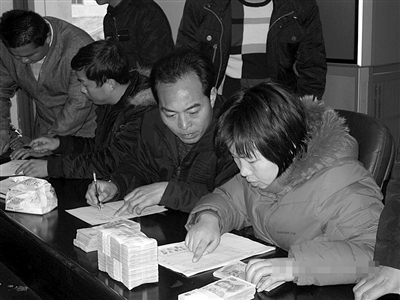 | 蔡福宇(中)在核对发放追讨回来的欠薪 |