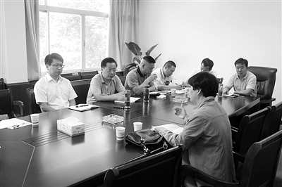 | 县委副书记、政法委书记王郁松(左一)在县委政法委会议室接待来访群众 |