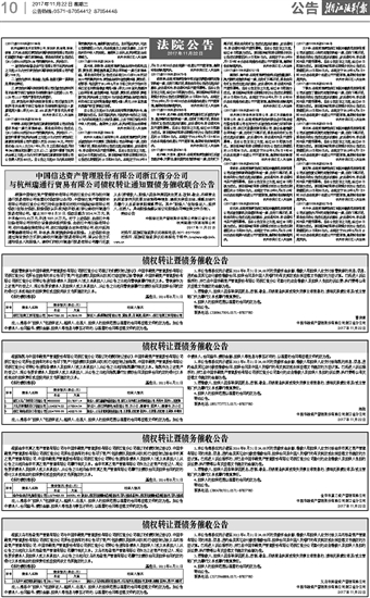 中国信达资产管理股份有限公司浙江省分公司 与杭州瑞通行贸易有限公司债权转让通知暨债务催收联合公告
