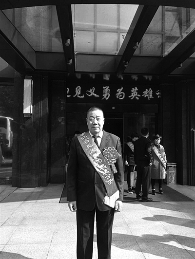 表彰会结束后,李荣春笔挺的藏青西装上,多了一条红色绸带和一块奖章,衬得他脸色更红润了。64岁的他,剃着利落的板寸,身材高大,精神矍铄。2008年从发电厂退休后,他坚持每天走跑20公里锻炼,这也给了他事发时“空手夺刃”的底气。
