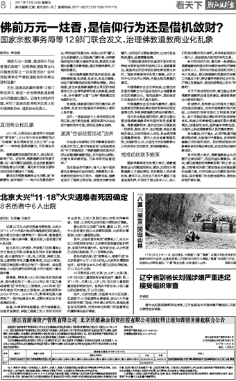 对于不容忽视的内因,意见提出支持佛教界道教界加强自身建设,增强抵御商业化侵蚀的能力。