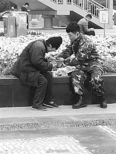 据网友日前拍摄,南昌八一广场一军哥哥给路边老人买快餐,还用自己的双手去给老人暖手。暖心的一幕让人感动。