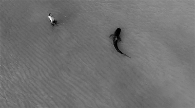 近日,在美国迈阿密海滩,无人机拍摄到一头虎鲨从游泳人群边游过的惊魂一幕。
