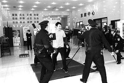 近日,平湖法院在立案大厅安检处进行了一场突发事件应急处置模拟演练。“突发情况”发生时,指挥员接报后迅速启动应急预案,“闹事当事人”当场被法警控制住。整场演练部署严密、组织到位。