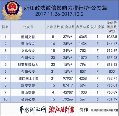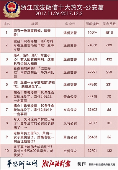 本期公安热文榜中,“温州交警”的表现实在抢眼,11月30日推送的8篇图文中竟有5篇入榜,并一举拿下了榜单前5名。其中位居榜首的《您有一份重要通知,请查收》,用H5的形式生动展示了2017年温州交警的工作成绩单,此文也因此获得了“10万+”的阅读量。