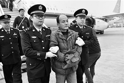 | 周骥阳被押解抵达杭州萧山机场 王毅 摄 |