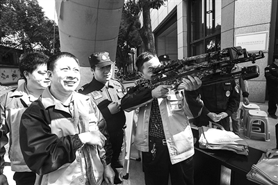 近日,台州市公安局黄岩分局组织开展了安全防范进村入企大宣传活动,利用展板、视频、宣传资料等,宣传消防安全、防范电信诈骗等知识。图为民警在企业宣传时,工人们体验警用装备的情景。