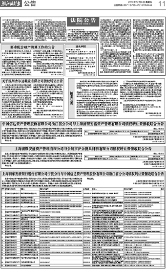 中国信达资产管理股份有限公司浙江省分公司与上海浦银安盛资产管理有限公司债权转让暨催收联合公告