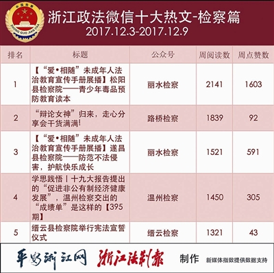 本期检察院热文榜,“丽水检察”的【“爱·相随”未成年人法治教育宣传手册展播】系列消息表现不俗,内容图文并茂又很实用,共有三篇进入榜单前十。“缙云检察”在国家宪法日当天举行宪法宣誓仪式,并推送微信消息,获得热文榜第五名。