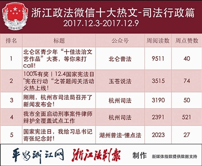 本期司法行政热文榜份量十足,线上活动搞得火热,都是为了宣传我国第四个国家宪法日。“北仑普法”的《北仑区青少年“十佳法治文艺作品”大赛,等你来打call!》获第一名,“玉苍说法”的《100%有奖|12.4国家宪法日“宪在行动”之答题闯关活动火热上线!》获第二名。