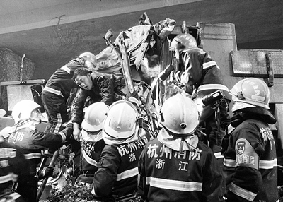 货车撞上高架桥墩 消防冒雨紧急救人