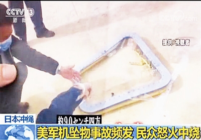 连日来,驻日美军基地事故频发,引发冲绳民众强烈不安。13日,美海军陆战队大型运输直升机“CH-53”的一扇机窗掉落到日本普天间第二小学的操场,砸起的石块划伤了一名小学生。东京电视台的监控摄像机清楚地拍摄到了机窗坠落的画面。朝日电视台还按照1:1的比例制作了同等大小的窗户,称如果是直接砸到人的话,很可能已造成重大伤亡事故。