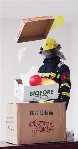 为控制爆炸威力,消防员特意选用了3个漏气最为严重的氢气气球,将他们和一些纸巾一起,放置在1个大小适中的密闭的纸板箱中,纸箱一侧只预留了一个点火用的小孔。