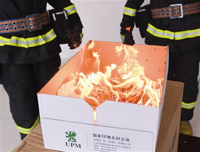 一切准备就绪,1名消防员从小孔位置向纸箱内的氢气气球点火。只听“嘭”的一声,纸箱内1个氢气气球发生了爆炸,随着1个火球升起,整个纸箱腾空而起,纸箱的盖子更是被弹到了接近天花板的位置。