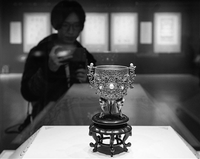 12月21日,观众在南京博物院“走进养心殿”特展上欣赏展出的金嵌珠宝“金瓯永固”杯。