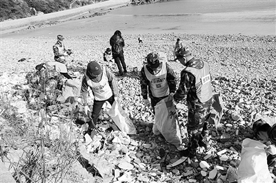 近日,舟山公安边防支队罗家岙边防派出所开展了一场以“千岛舟山,共创蔚蓝”为主题的净滩活动。边防官兵和群众分工合作,手持夹钳、垃圾袋等工具,捡拾散落在辖区海滩上的破塑料布、饮料瓶、废旧轮胎、烟头、渔网等垃圾。本报记者 郑嘉男 通讯员 邹训永