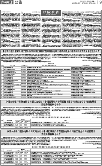 中国农业银行股份有限公司浙江省分行与中国长城资产管理股份有限公司浙江省分公司债权转让 暨债务催收联合公告
