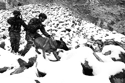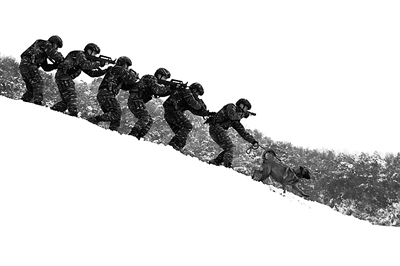 气温低至零下5℃,大雪早已将“凶徒”的行踪隐去。警犬“杜灵”带领6名特战队员踏雪寻踪,经过2个多小时的搜索,成功找到2名“暴恐分子”。