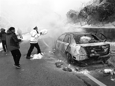1月31日上午9点,S211省道诸东线岭腰路段,一辆轿车着火,东阳市公安局交警大队巍山中队中队长陈江平等民警,在巡查时发现该情况后,立即找来灭火器对车子进行灭火,后轮番搬起雪球扔进车内,最终将火扑灭。