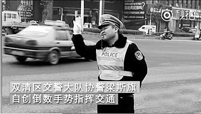 梁斯旗是湖南邵阳双清区的一名交警,他发现信号灯没有读秒功能,就面带微笑用手势为过往司机和行人倒数“读秒”,喜感十足。司机们对这个“萌”交警印象很深,都说看到他的手势后,心里“暖暖的”。