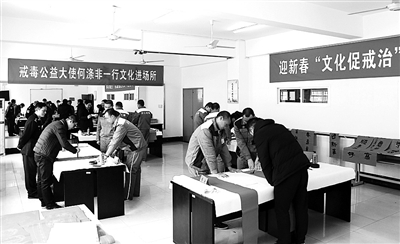 近日,省良渚强制隔离戒毒所举行以“书迎新春 法润心田”为主题的公益活动,邀请省戒毒公益大使,省书法家协会主席团成员、副秘书长何涤非等书法家走进戒毒所,为戒毒人员书写、赠送春联,以此激励戒毒人员戒除毒瘾、努力开始新的生活。