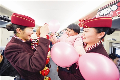 1月31日,在南昌西开往南京南的G1496次列车上,乘务员与小旅客互动。